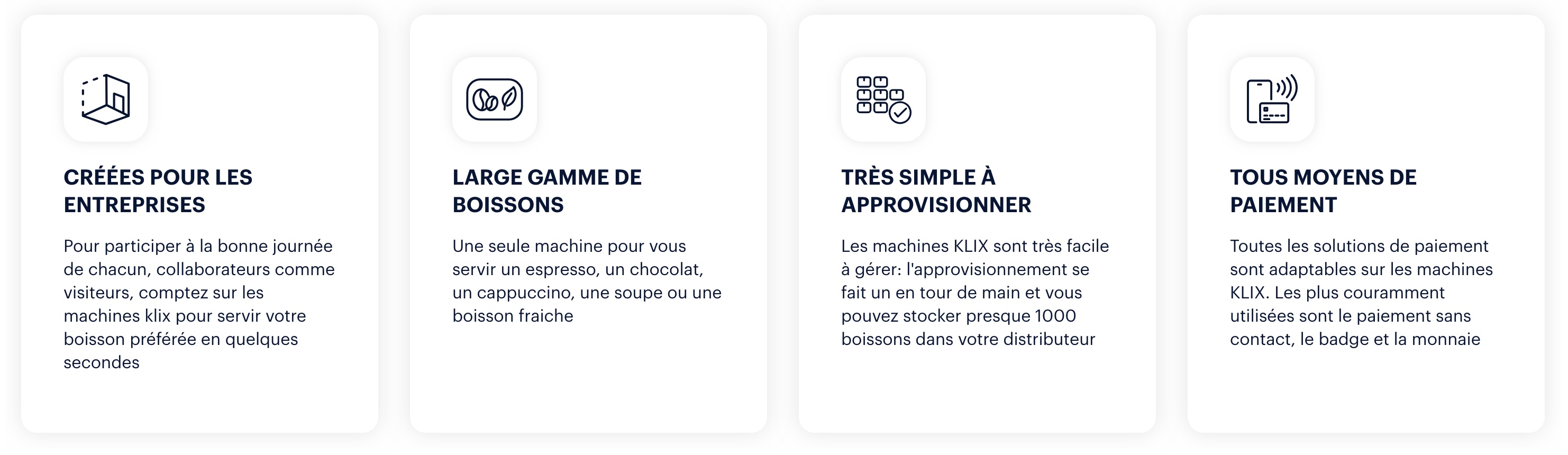 Les ingrédients sont déjà dans le gobelet, la machine ne fait qu’y ajouter de l’eau. Grâce à cette technologie, le processus complexe de mélange des ingrédients ne se fait plus directement dans le distributeur. Les gobelets sont scellés et l’hygiène est donc parfaite. Ils sont livrés en ramettes et sont prêts à être insérés facilement dans le distributeur.